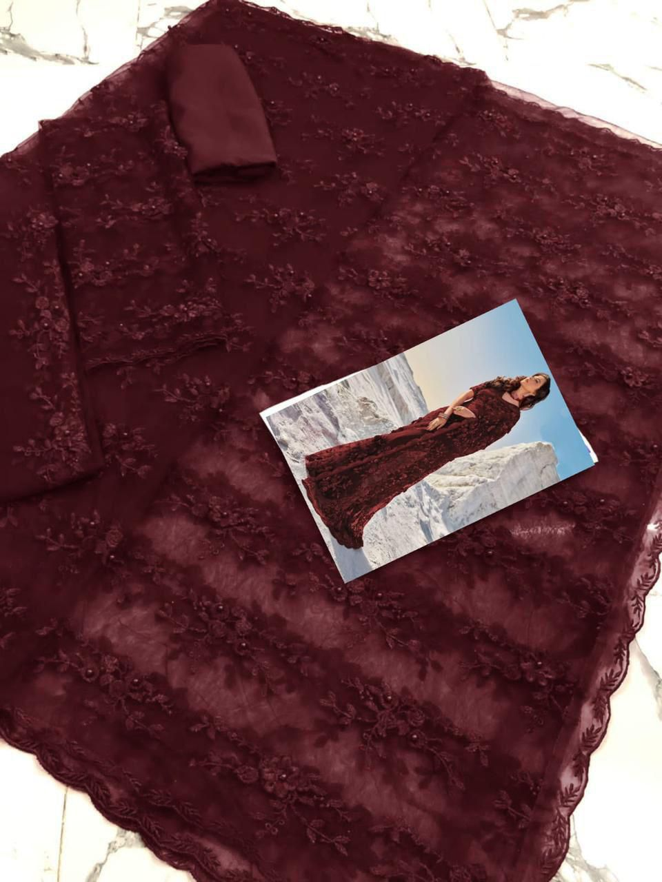 Discover timeless elegance with our Indian Stylish Saree, crafted on premium imported net fabric and available in two stunning shades — Red and Maroon. The saree features exquisite thread embroidery enhanced with delicate 3D flower appliqués and punch balls, giving it a luxurious, dimensional look. With an approximate length of 6.5 yards, it drapes beautifully while maintaining a graceful, lightweight flow perfect for festive and formal occasions.